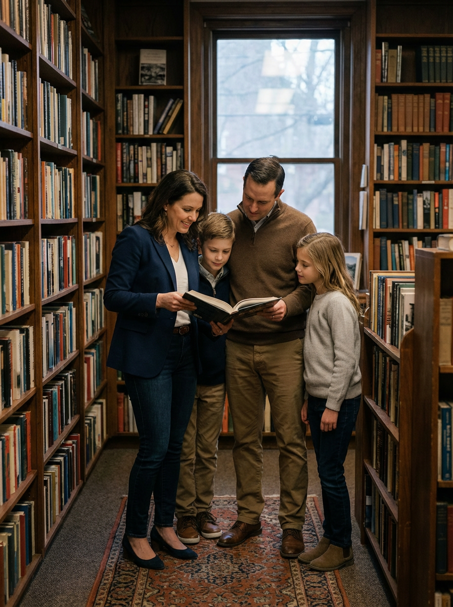 family portrait in library or bookstore, everyone wearing smart casual clothing, bookshelves in background, reading or looking at books together, quiet and intellectual atmosphere