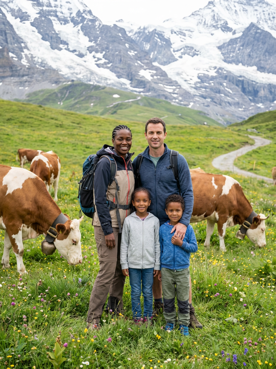 family portrait in Swiss mountain meadow with grazing cows, everyone wearing casual hiking outfits, alpine grass and wildflowers, snow-capped peaks in background, traditional Swiss cows nearby, fresh mountain air atmosphere, natural alpine lighting, peaceful countryside setting