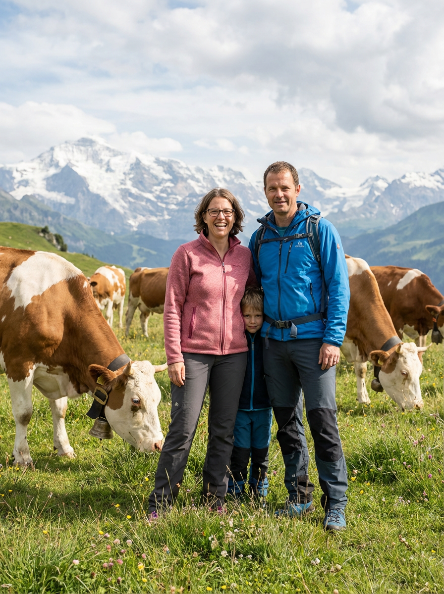 family portrait in Swiss mountain meadow with grazing cows, everyone wearing casual hiking outfits, alpine grass and wildflowers, snow-capped peaks in background, traditional Swiss cows nearby, fresh mountain air atmosphere, natural alpine lighting, peaceful countryside setting