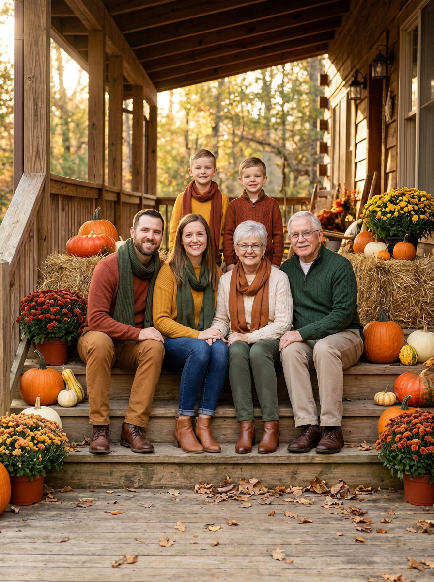family portrait on front porch of house, everyone wearing coordinated autumn colors, soft afternoon lighting, fall decorations visible, sitting on porch steps, comfortable and welcoming atmosphere