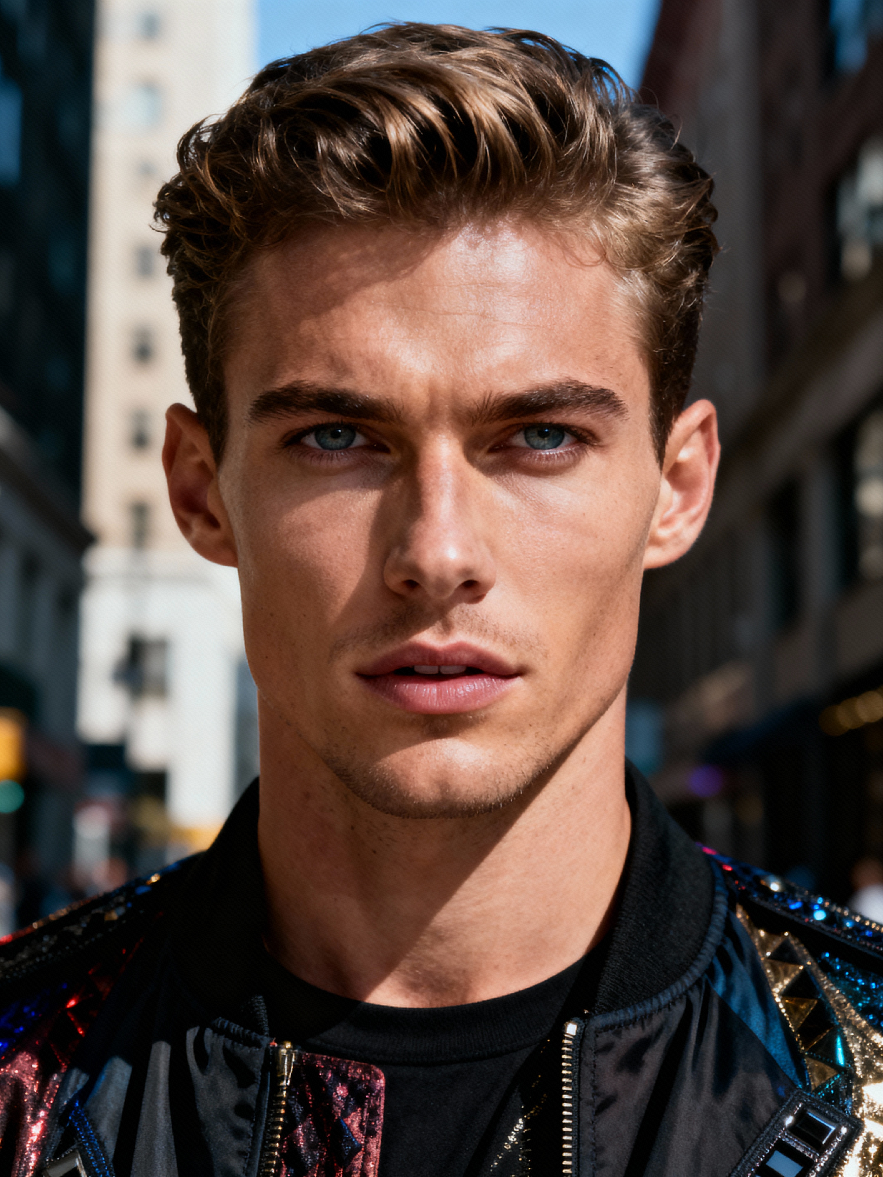 Fashion insanely beautiful model on location shoot. Wearing fashion-forward outfit, strong presence. Urban backdrop, professional fashion photography.