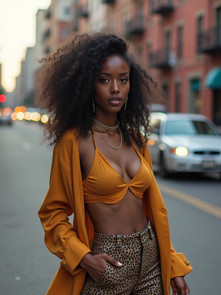 Fashion insanely beautiful model on location shoot. Wearing seasonal collection pieces, dynamic pose . Urban backdrop, professional fashion photography.