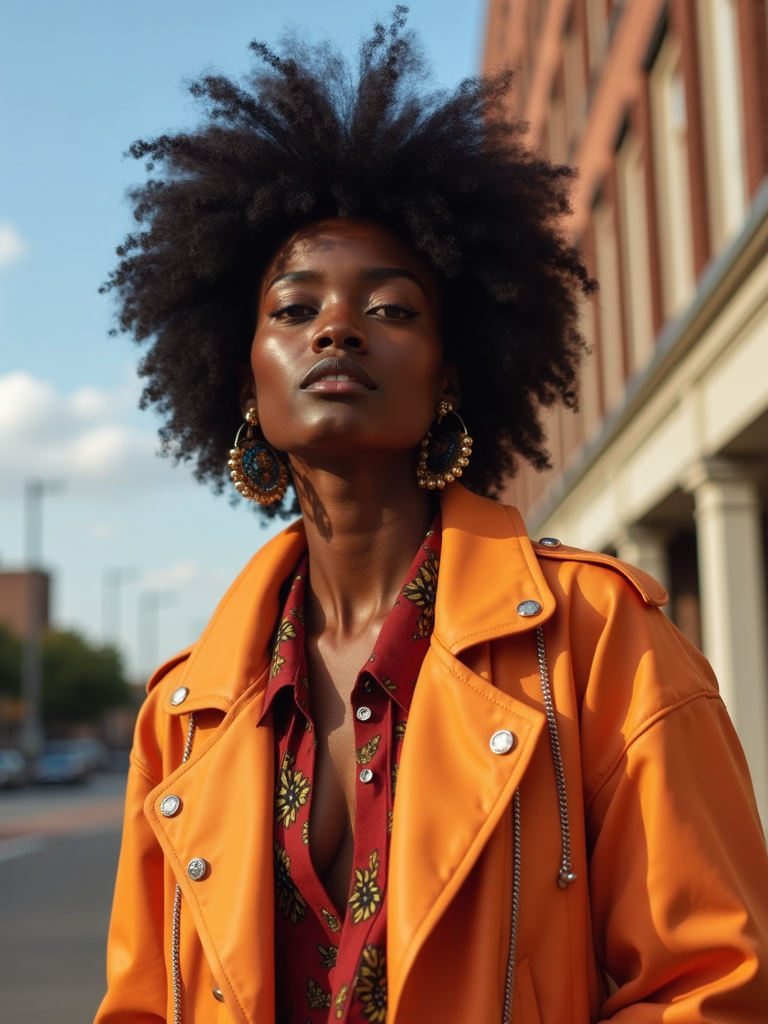 Fashion insanely beautiful model on location shoot. Wearing seasonal collection pieces, dynamic pose . Urban backdrop, professional fashion photography.