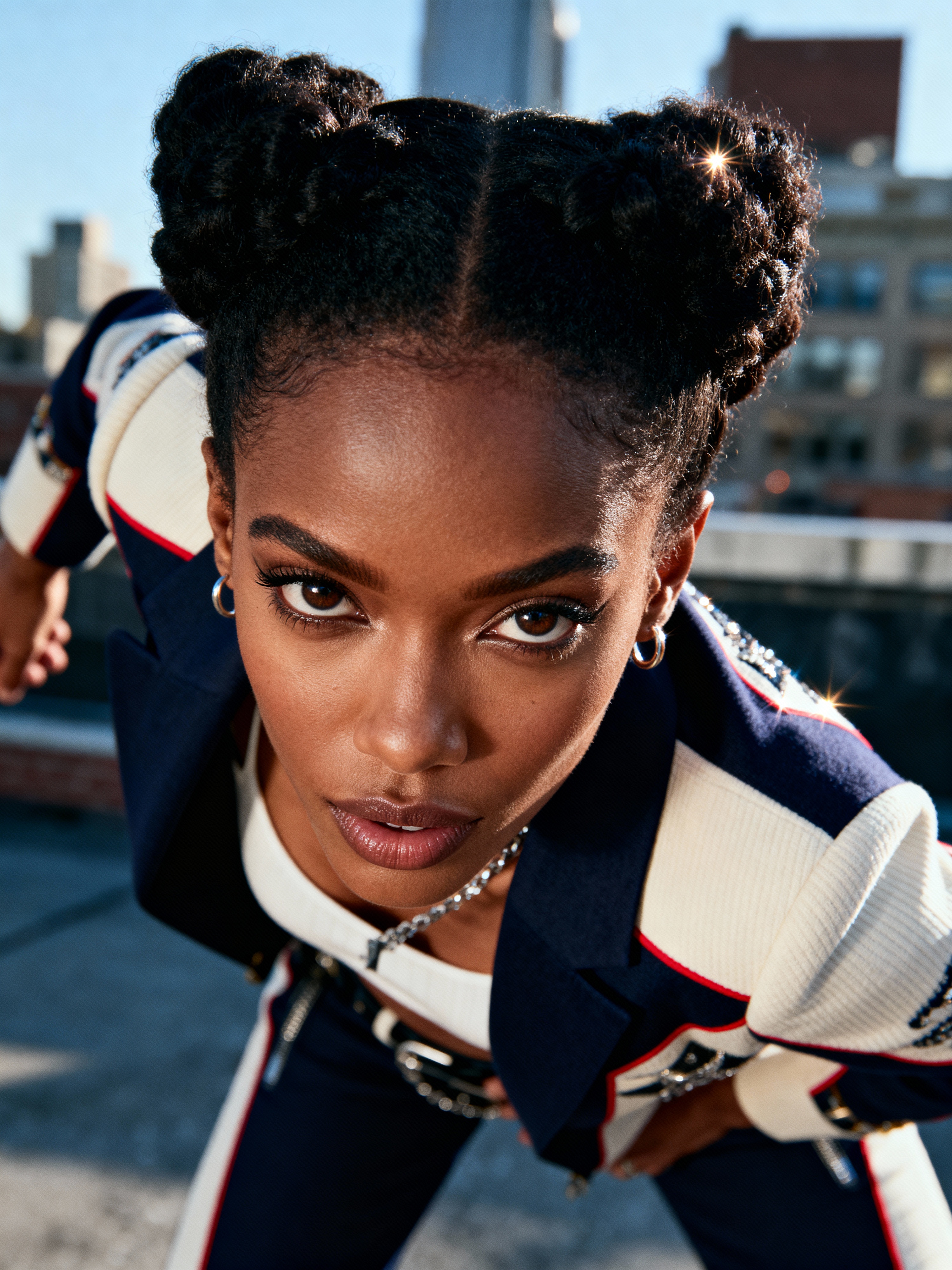 Fashion insanely beautiful model on location shoot. Wearing seasonal collection pieces, dynamic pose . Urban backdrop, professional fashion photography.
