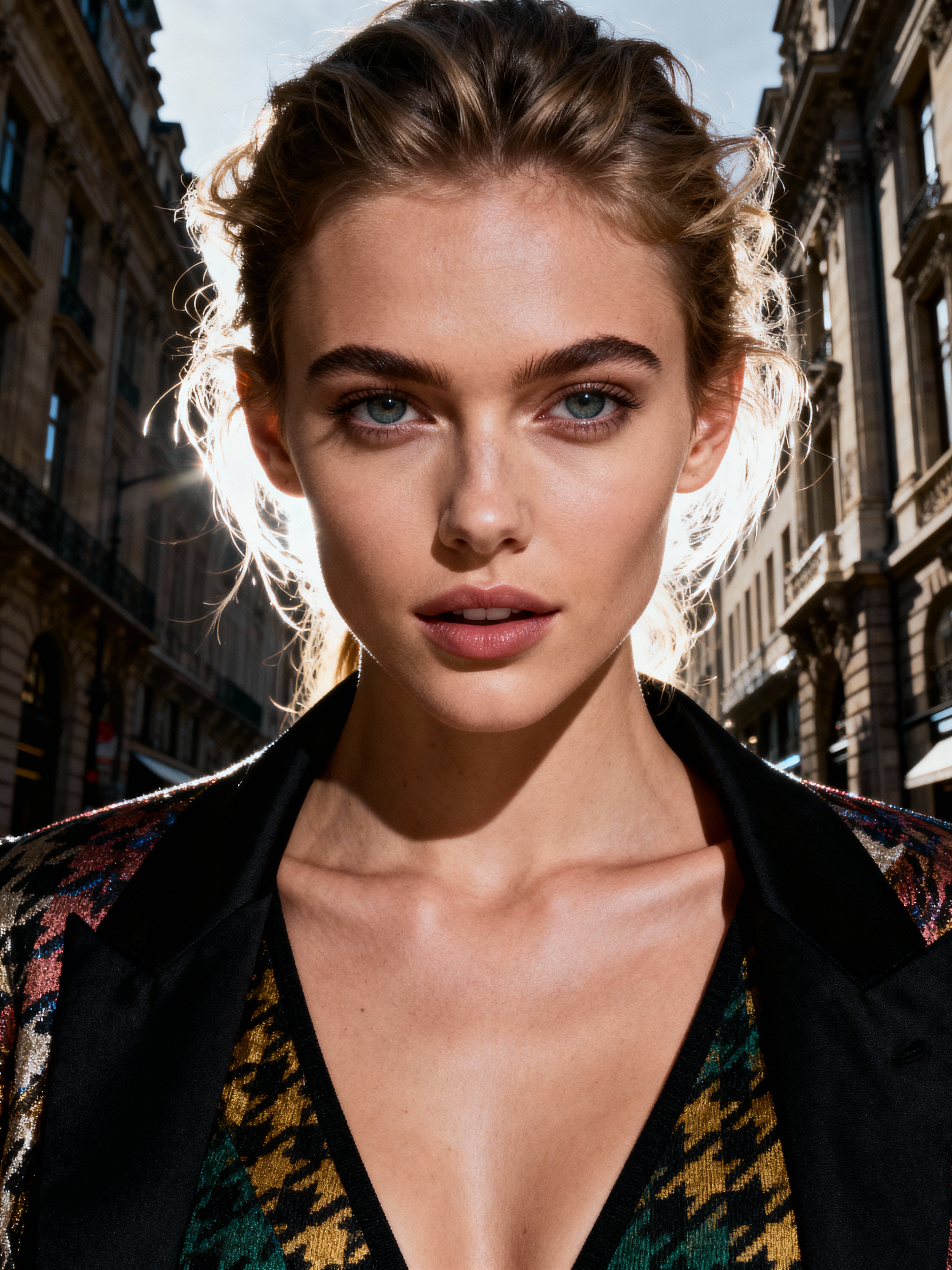 Fashion insanely beautiful model on location shoot. Wearing seasonal collection pieces, dynamic pose . Urban backdrop, professional fashion photography.