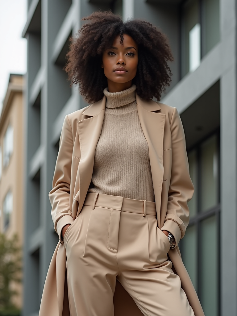 fashion model in a nude-colored long coat and high-waisted trousers with a turtleneck, posing in front of a modern building, soft shadows, professional fashion editorial style