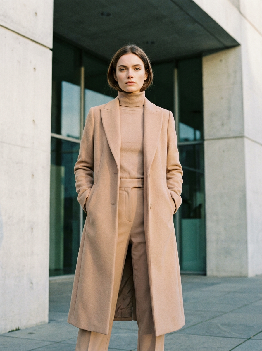 fashion model in a nude-colored long coat and high-waisted trousers with a turtleneck, posing in front of a modern building, soft shadows, professional fashion editorial style