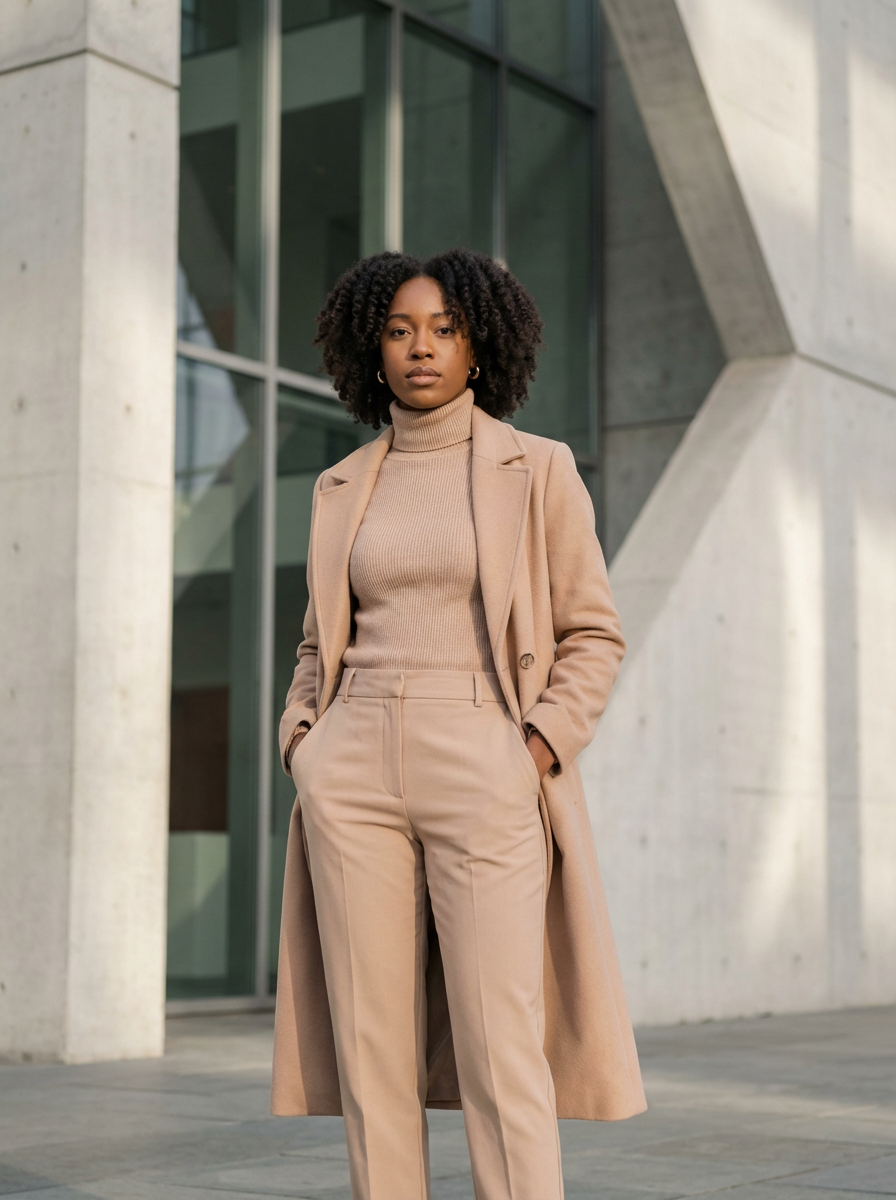 fashion model in a nude-colored long coat and high-waisted trousers with a turtleneck, posing in front of a modern building, soft shadows, professional fashion editorial style
