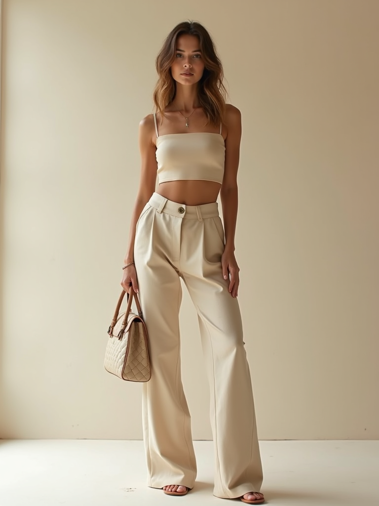 fashion model in nude-toned cropped top and trousers, holding a neutral handbag, posing in soft daylight, minimalist aesthetic