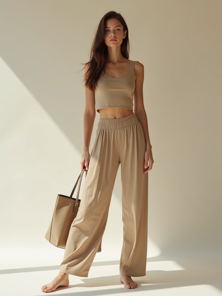 fashion model in nude-toned cropped top and trousers, holding a neutral handbag, posing in soft daylight, minimalist aesthetic