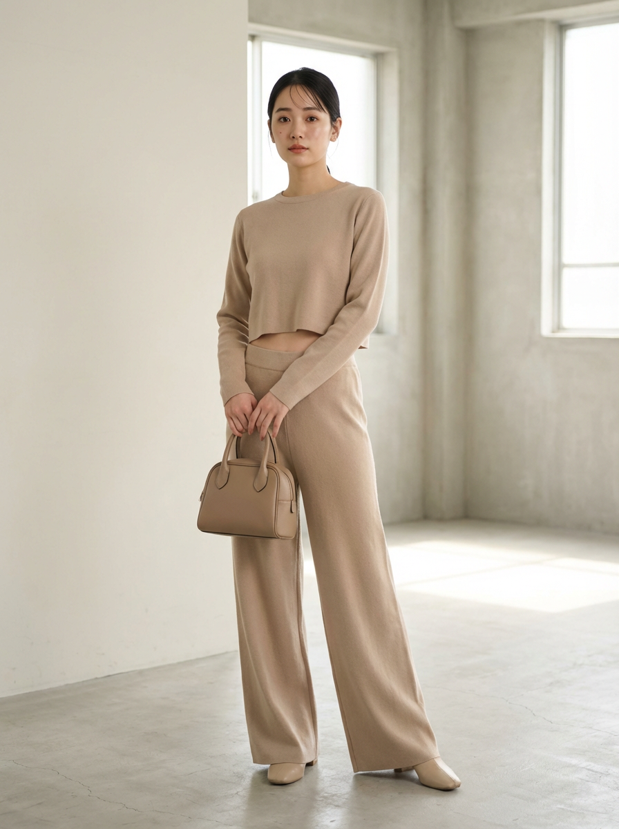 fashion model in nude-toned cropped top and trousers, holding a neutral handbag, posing in soft daylight, minimalist aesthetic