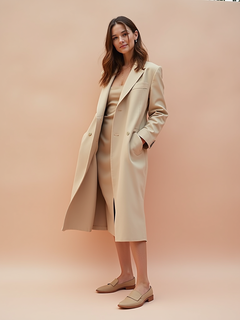 fashionable model in a nude-colored midi dress and matching coat, soft pastel background, luxury street style photography