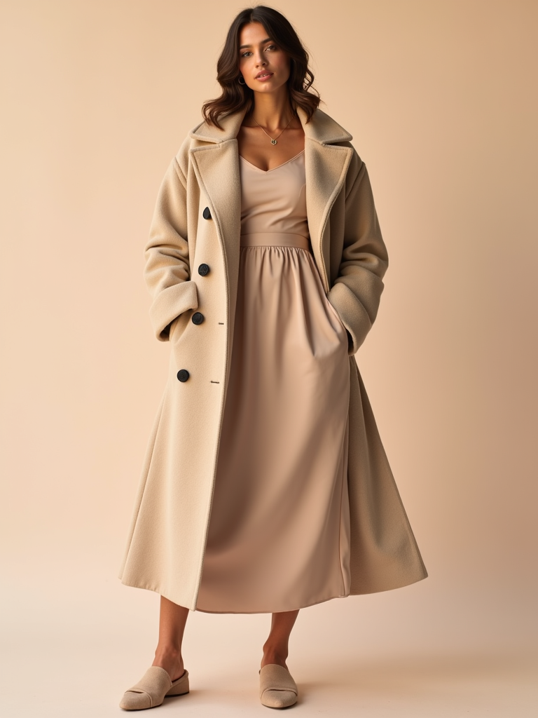 fashionable model in a nude-colored midi dress and matching coat, soft pastel background, luxury street style photography