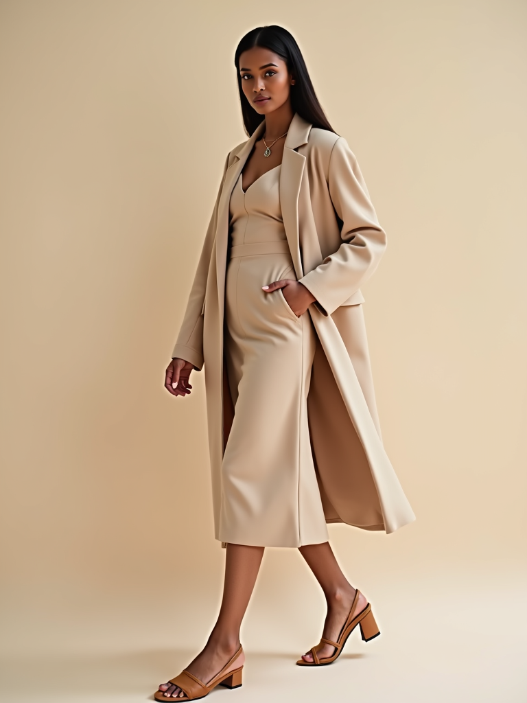 fashionable model in a nude-colored midi dress and matching coat, soft pastel background, luxury street style photography