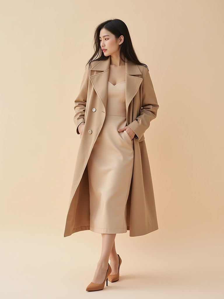 fashionable model in a nude-colored midi dress and matching coat, soft pastel background, luxury street style photography