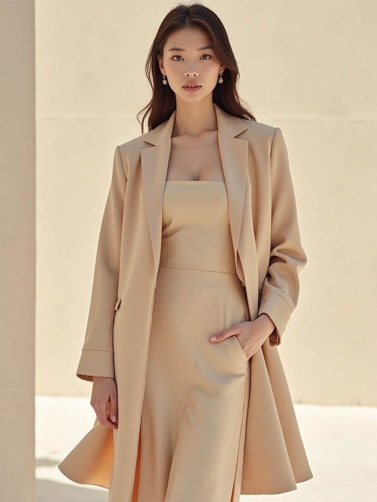 fashionable model in a nude-colored midi dress and matching coat, soft pastel background, luxury street style photography