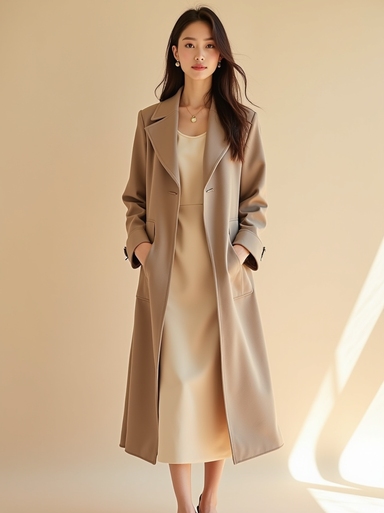 fashionable model in a nude-colored midi dress and matching coat, soft pastel background, luxury street style photography