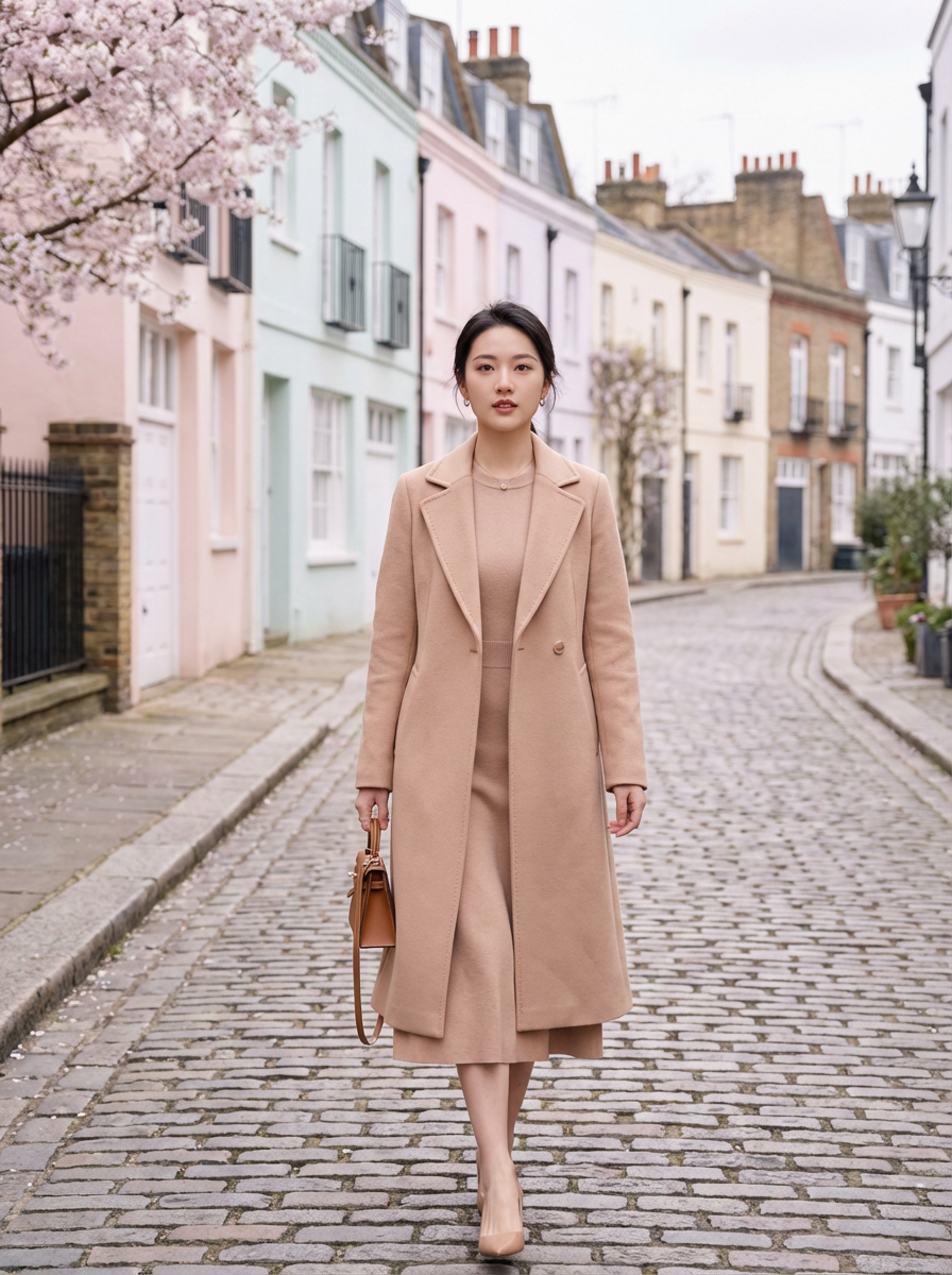fashionable model in a nude-colored midi dress and matching coat, soft pastel background, luxury street style photography