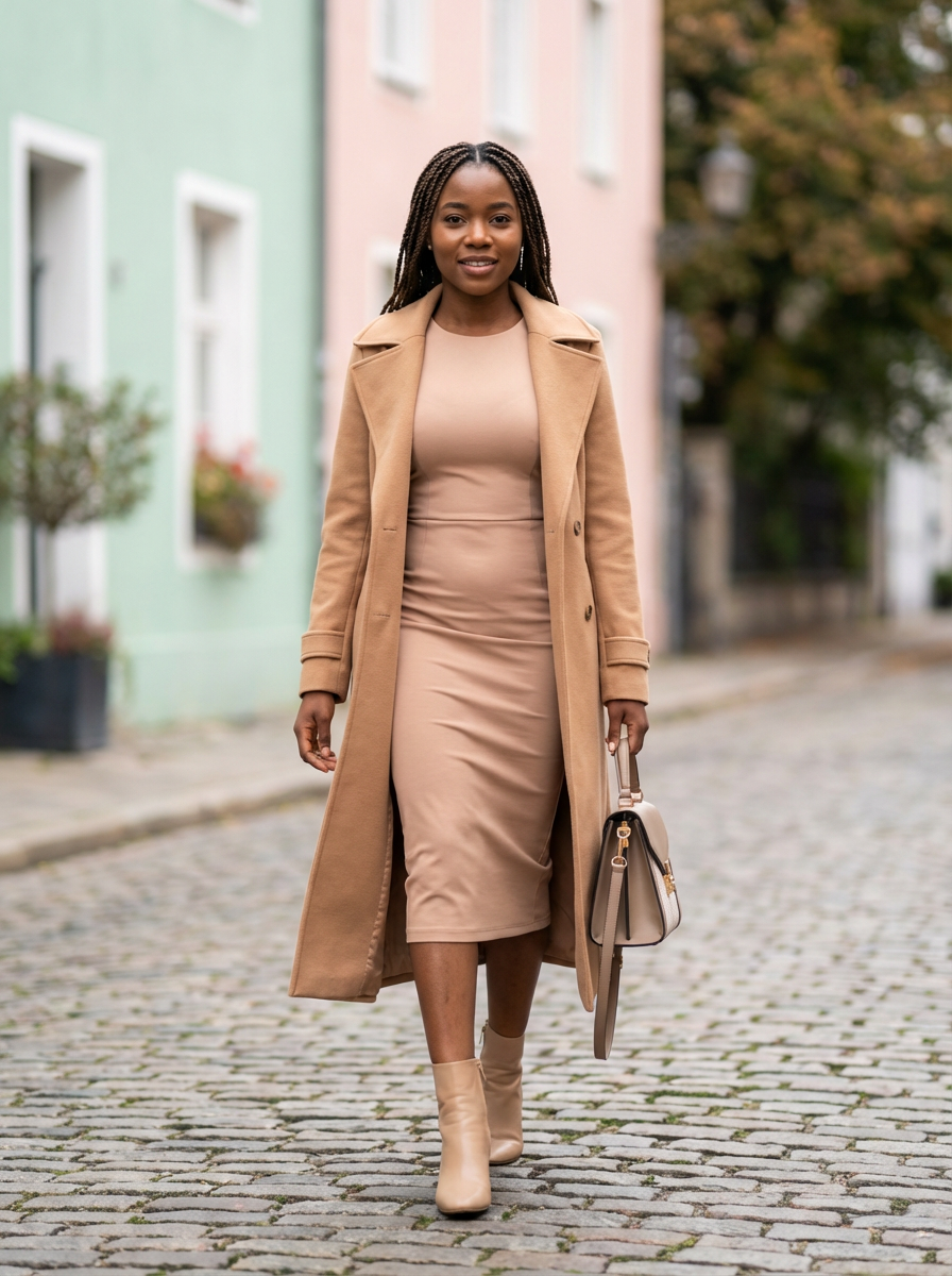 fashionable model in a nude-colored midi dress and matching coat, soft pastel background, luxury street style photography