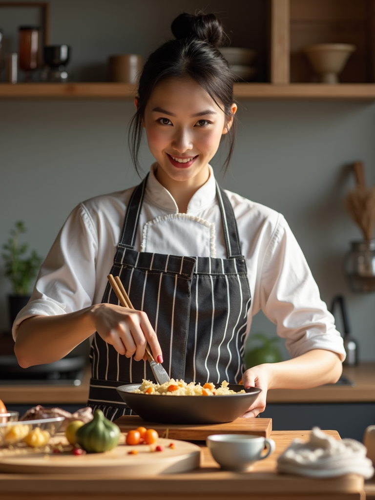 feminine model cooking or baking in a modern kitchen
