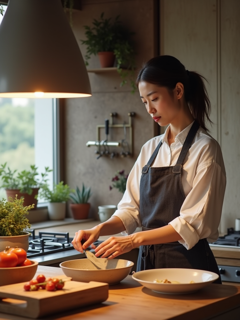 feminine model cooking or baking in a modern kitchen