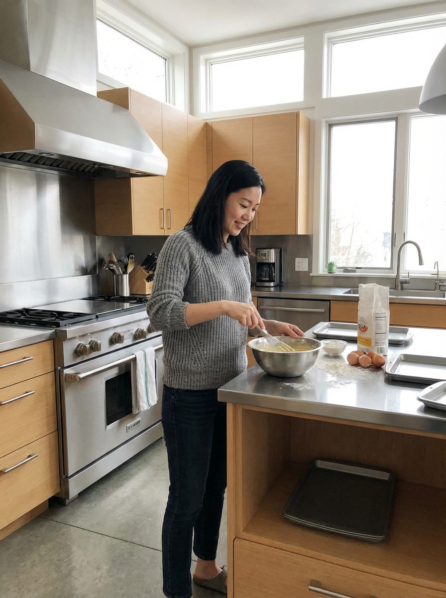 feminine model cooking or baking in a modern kitchen