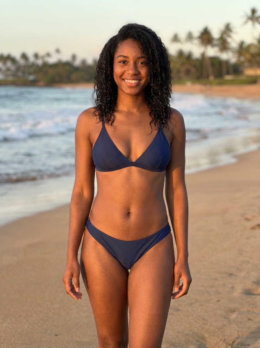 feminine model in solid color bikini on the beach, wet hair, swimsuit sports illustrated FHM maxim photos