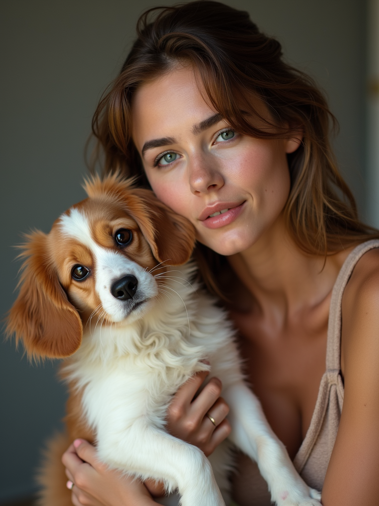 feminine model posing with a cute pet