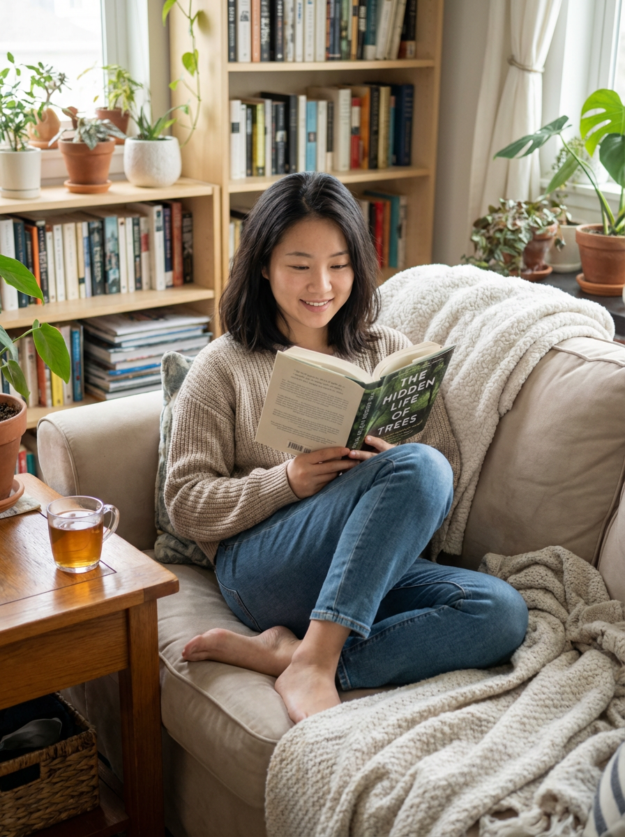 feminine model reading a book in a cozy home environment