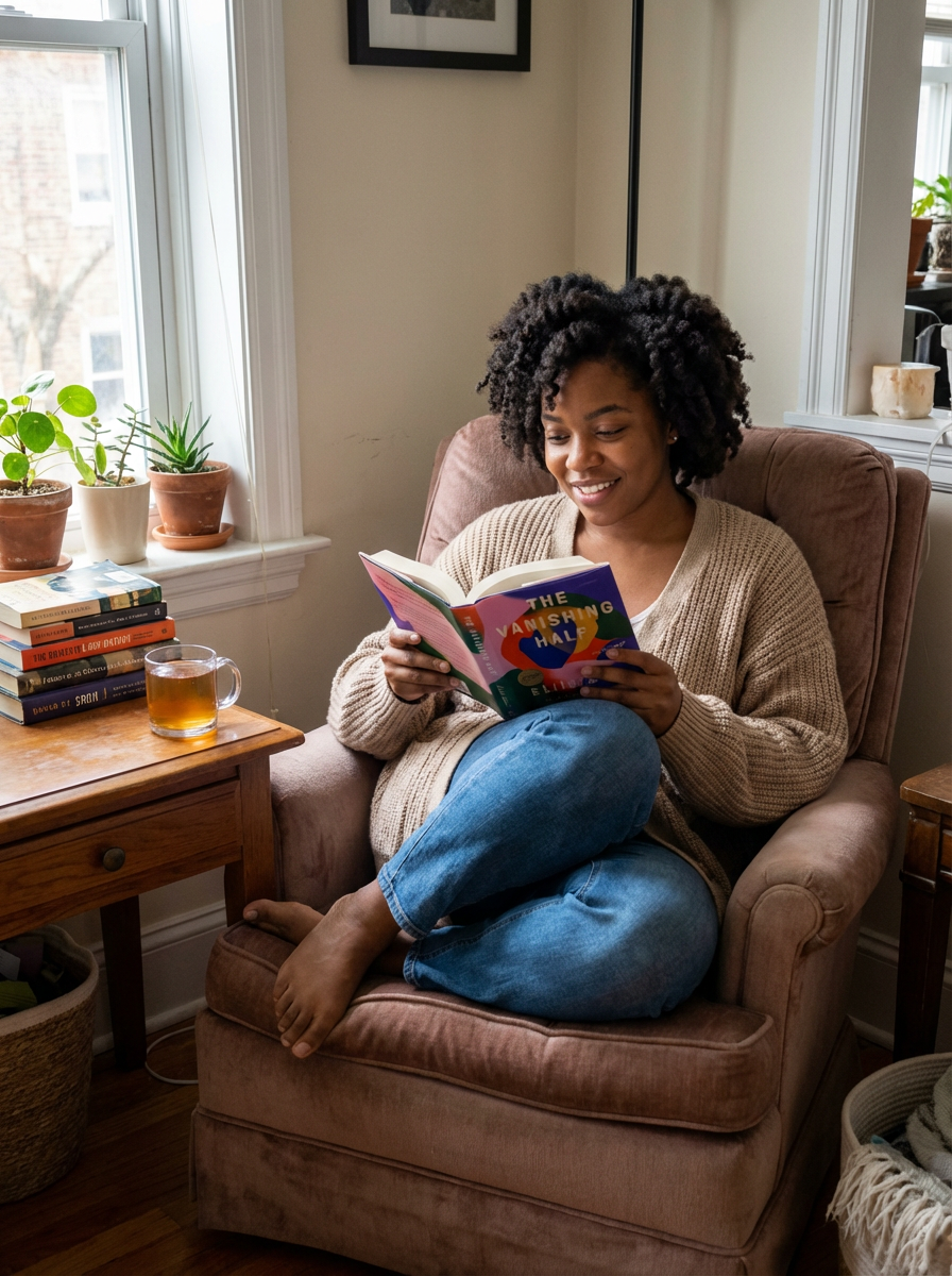 feminine model reading a book in a cozy home environment