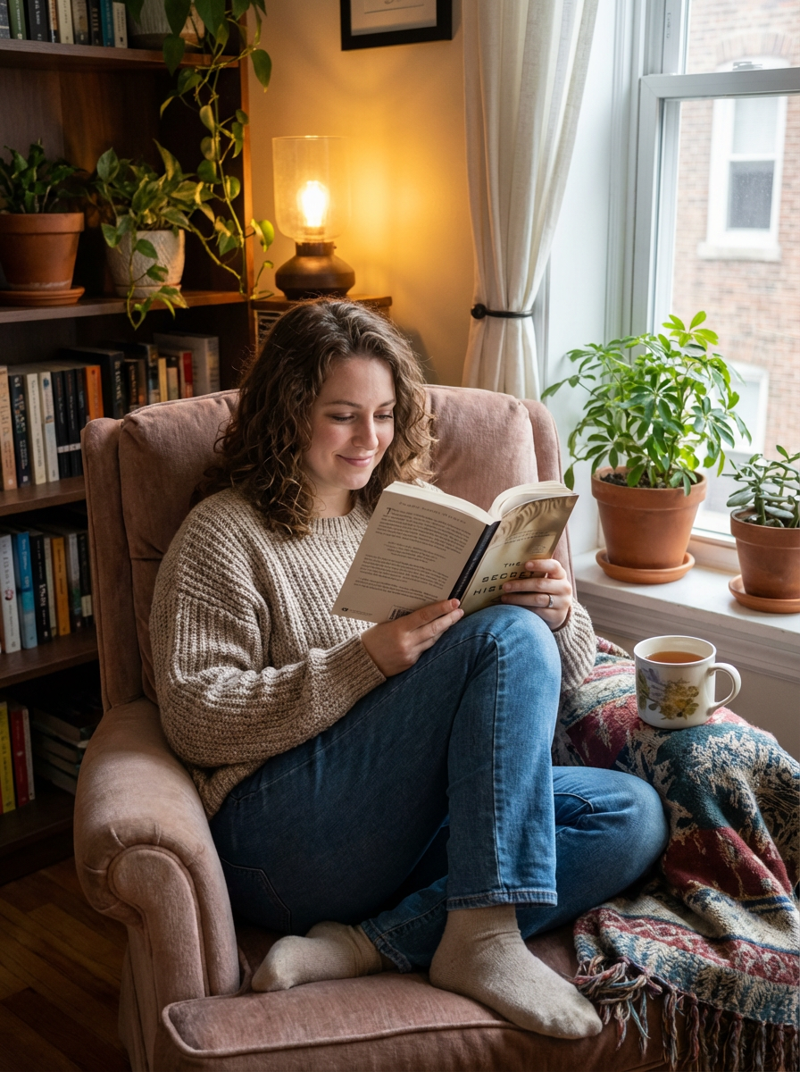 feminine model reading a book in a cozy home environment