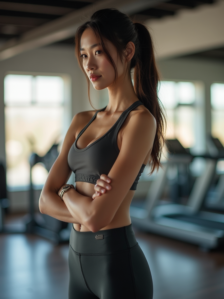feminine model wearing yoga pants or and sports top in the fitness gym