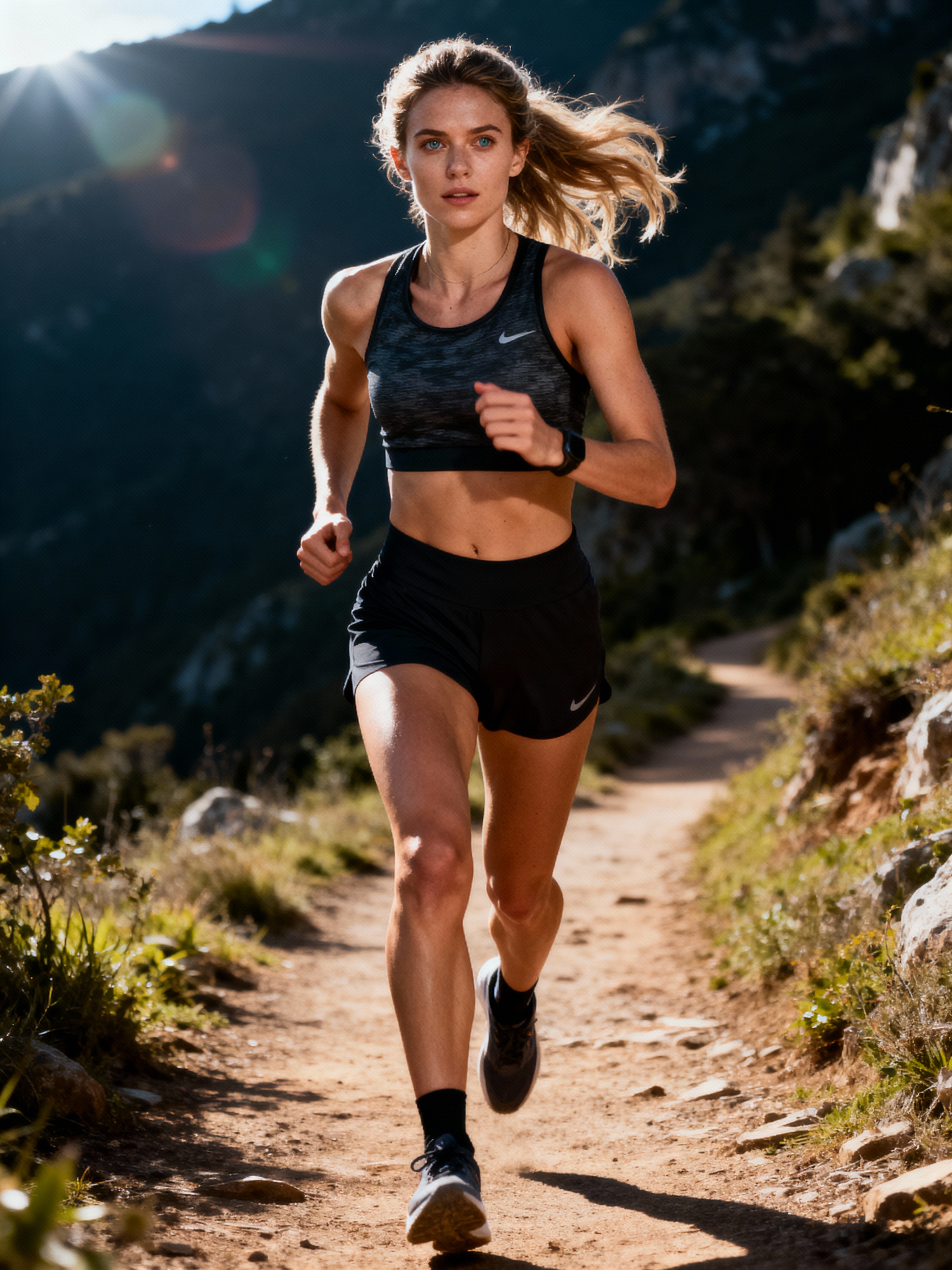 fit feminine model in athletic gear on a scenic running trail