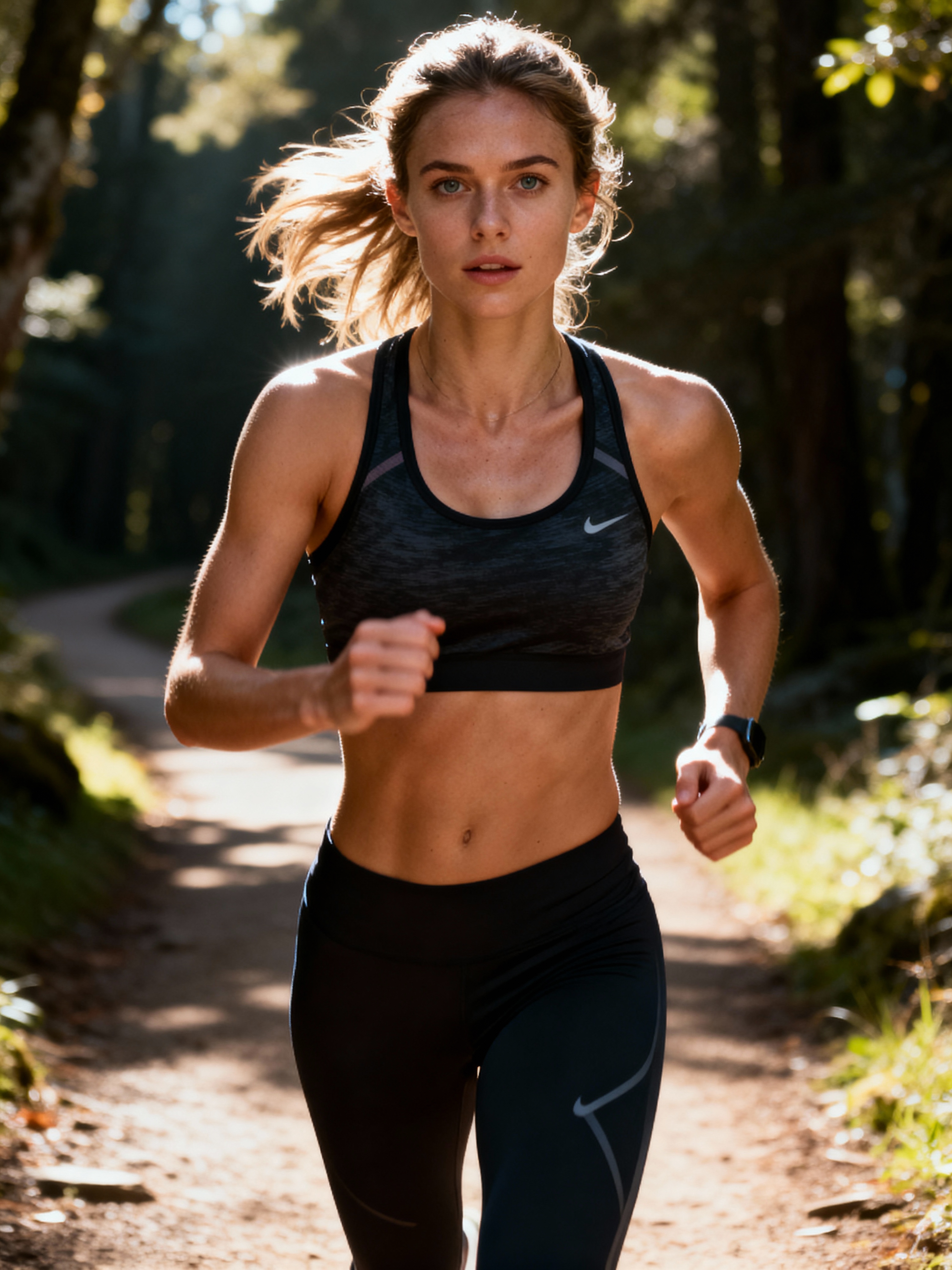 fit feminine model in athletic gear on a scenic running trail