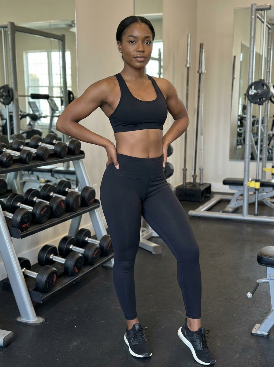 fit healthy model with toned physique, slim waist, toned arms , athletic wear, gym setting, confident pose