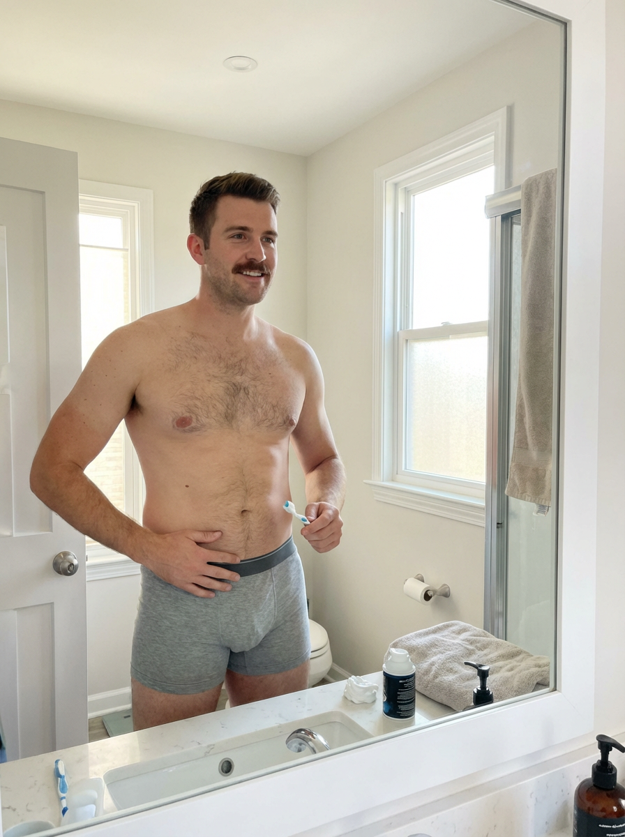 fit model in boxer briefs, morning routine, bathroom mirror, natural masculine confidence