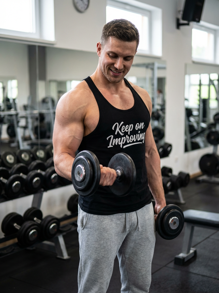 fit model lifting weights, muscular arms, defined chest, gym environment