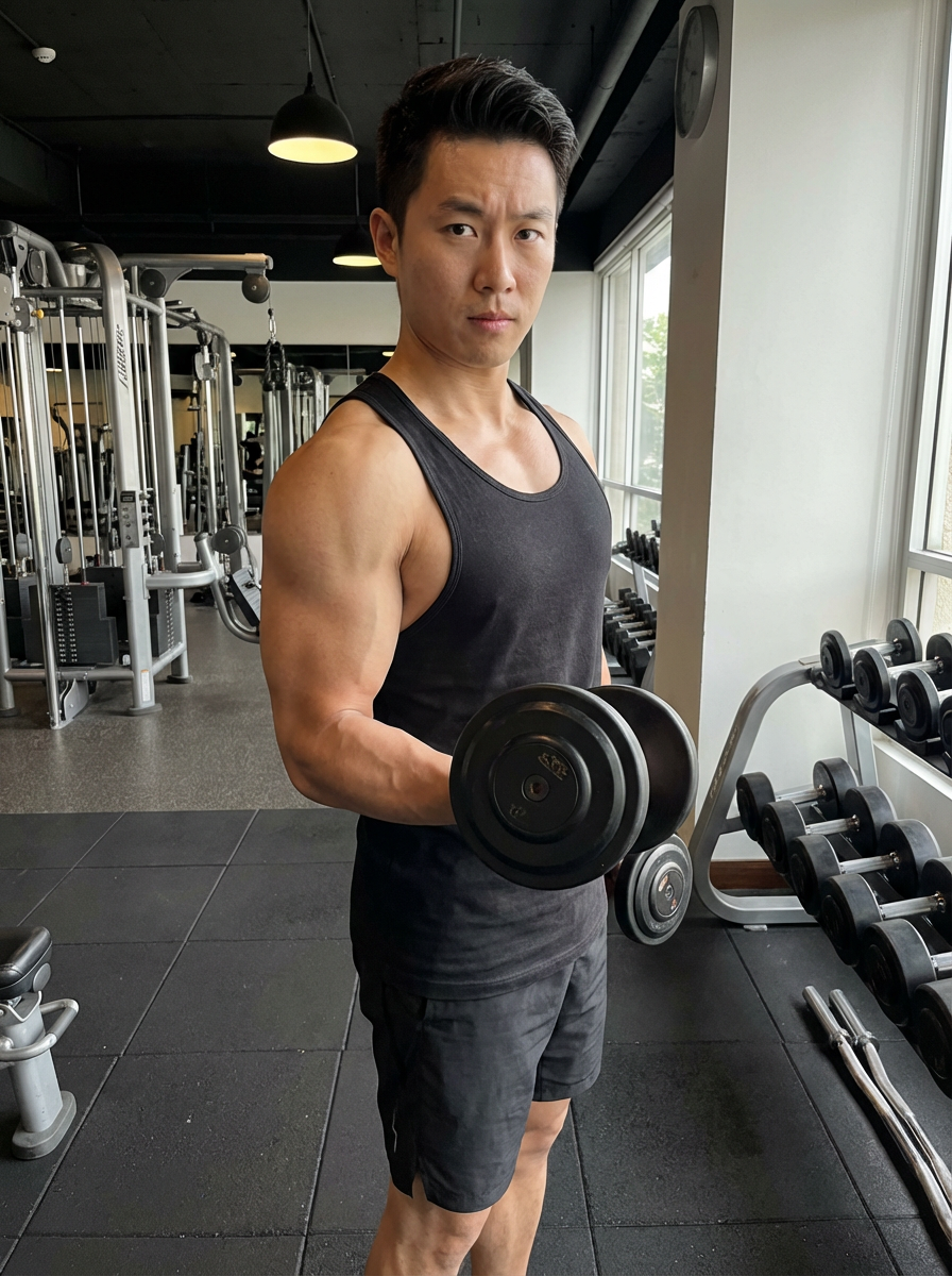 fit model lifting weights, muscular arms, defined chest, gym environment
