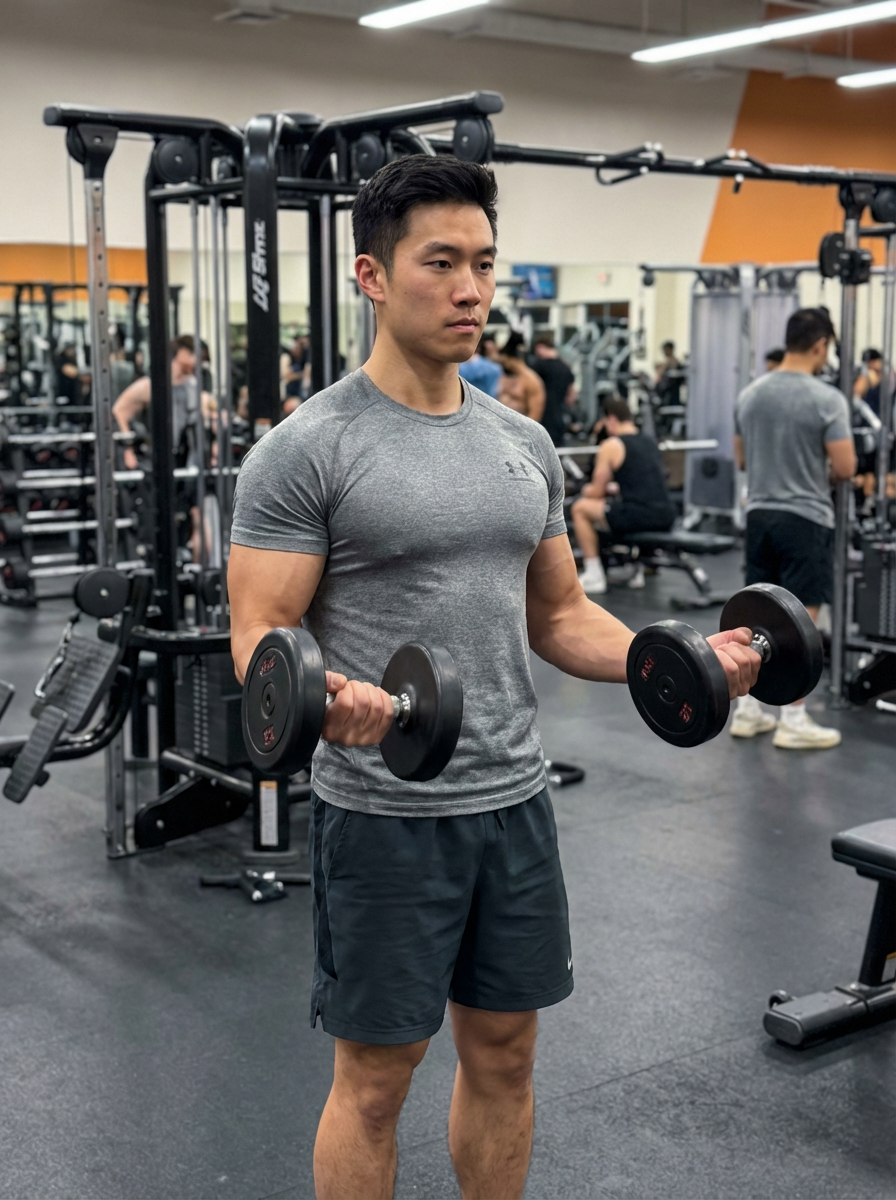 fit model lifting weights, muscular arms, defined chest, gym environment