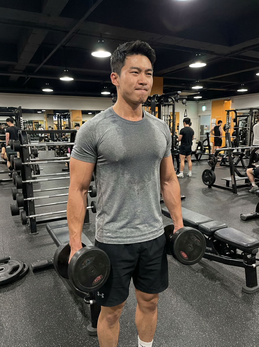 fit model lifting weights, muscular arms, defined chest, gym environment