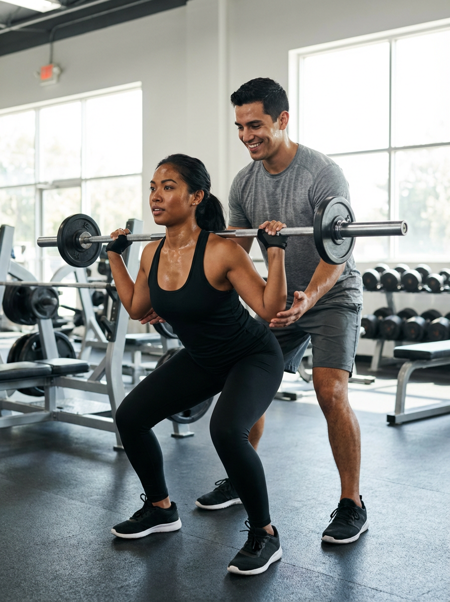 fit model lifting weights, muscular arms, defined chest, gym environment