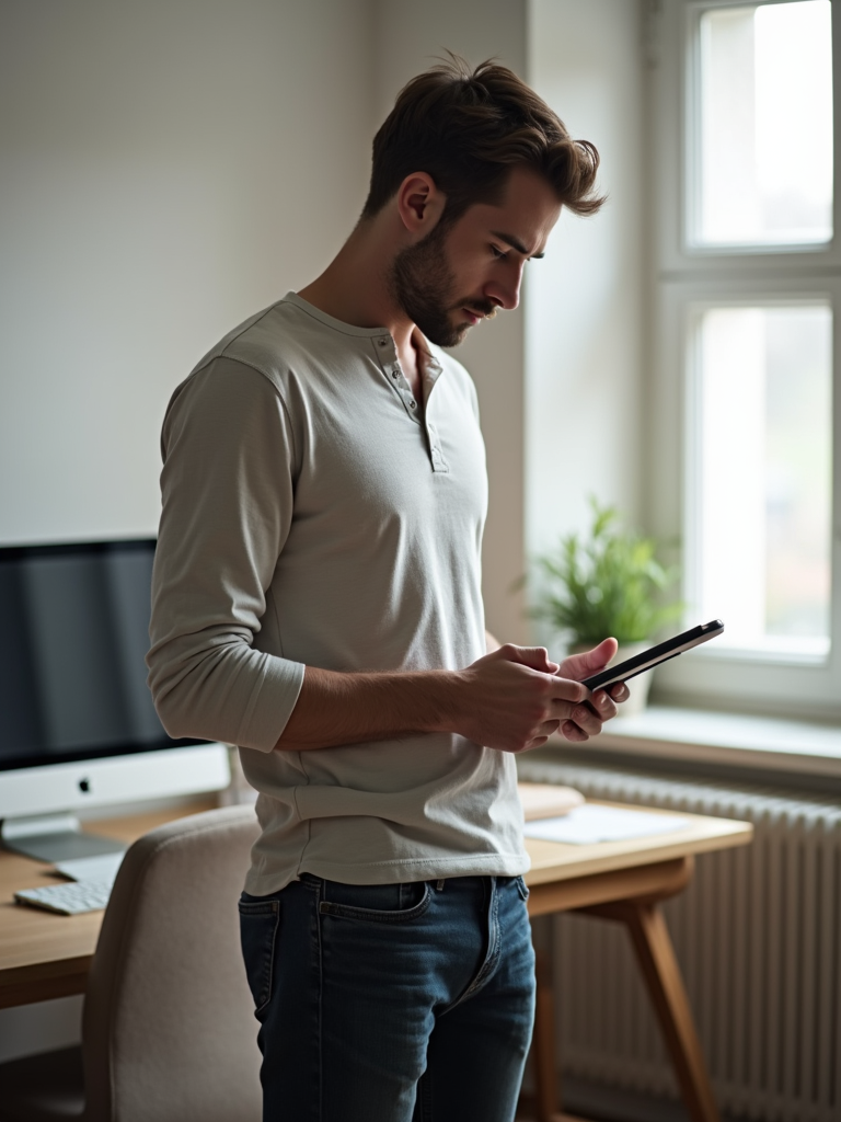 focused model in minimalist henley and dark jeans working with digital tablet, standing desk, minimalist office, soft natural light