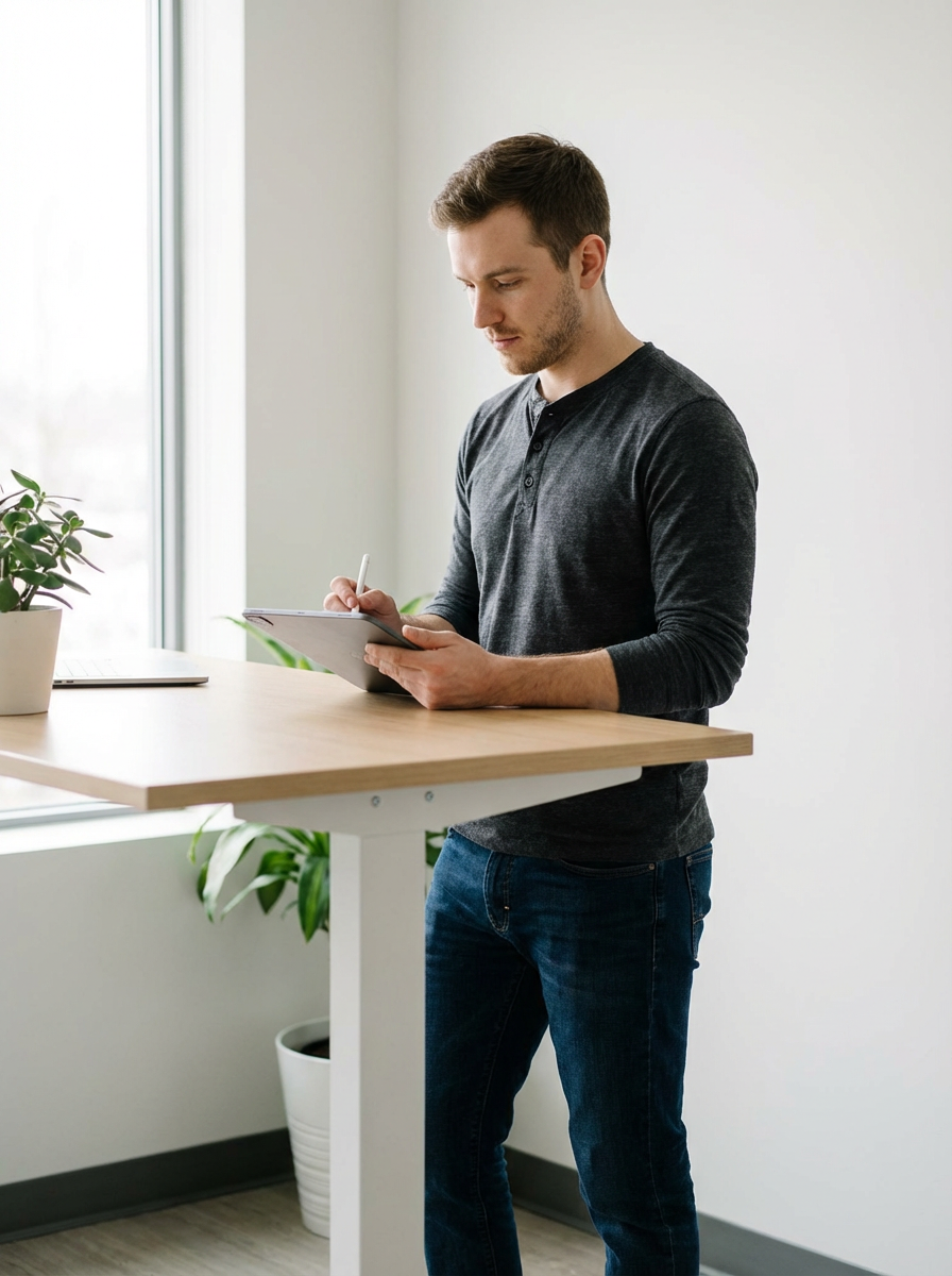 focused model in minimalist henley and dark jeans working with digital tablet, standing desk, minimalist office, soft natural light
