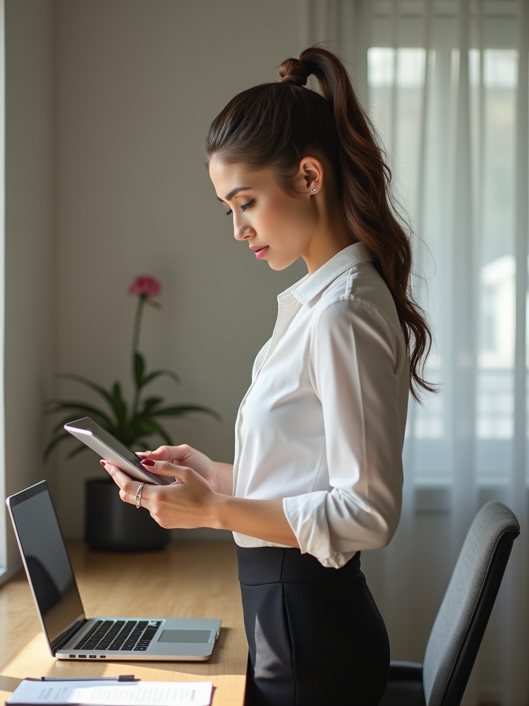 focused model in elegant yet comfortable business casual ensemble working with digital tablet, standing desk, minimalist office, soft natural light