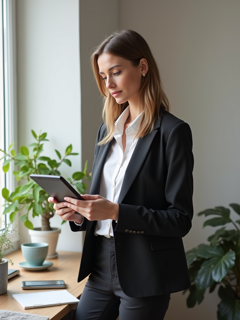 focused model in elegant yet comfortable business casual ensemble working with digital tablet, standing desk, minimalist office, soft natural light