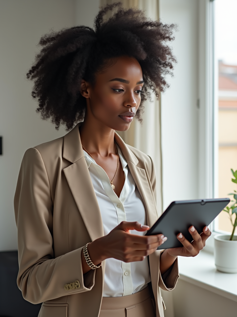 focused model in elegant yet comfortable business casual ensemble working with digital tablet, standing desk, minimalist office, soft natural light