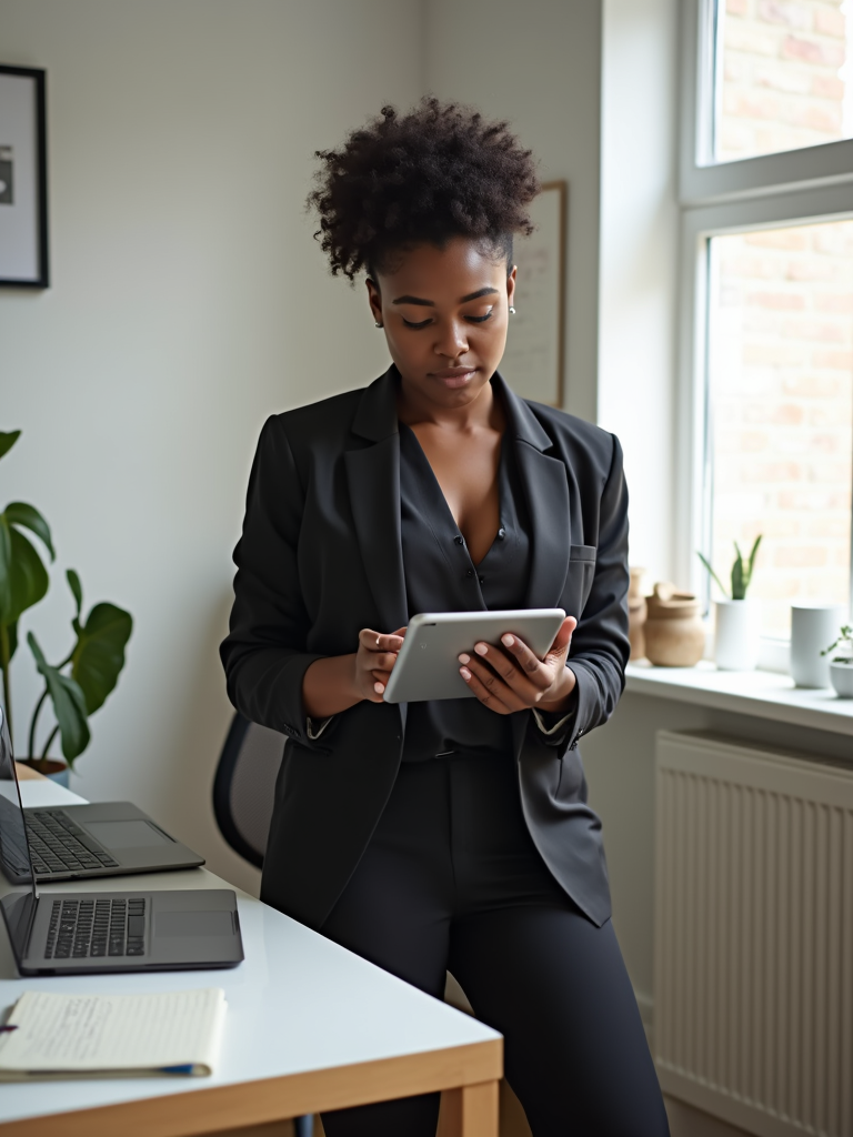 focused model in elegant yet comfortable business casual ensemble working with digital tablet, standing desk, minimalist office, soft natural light