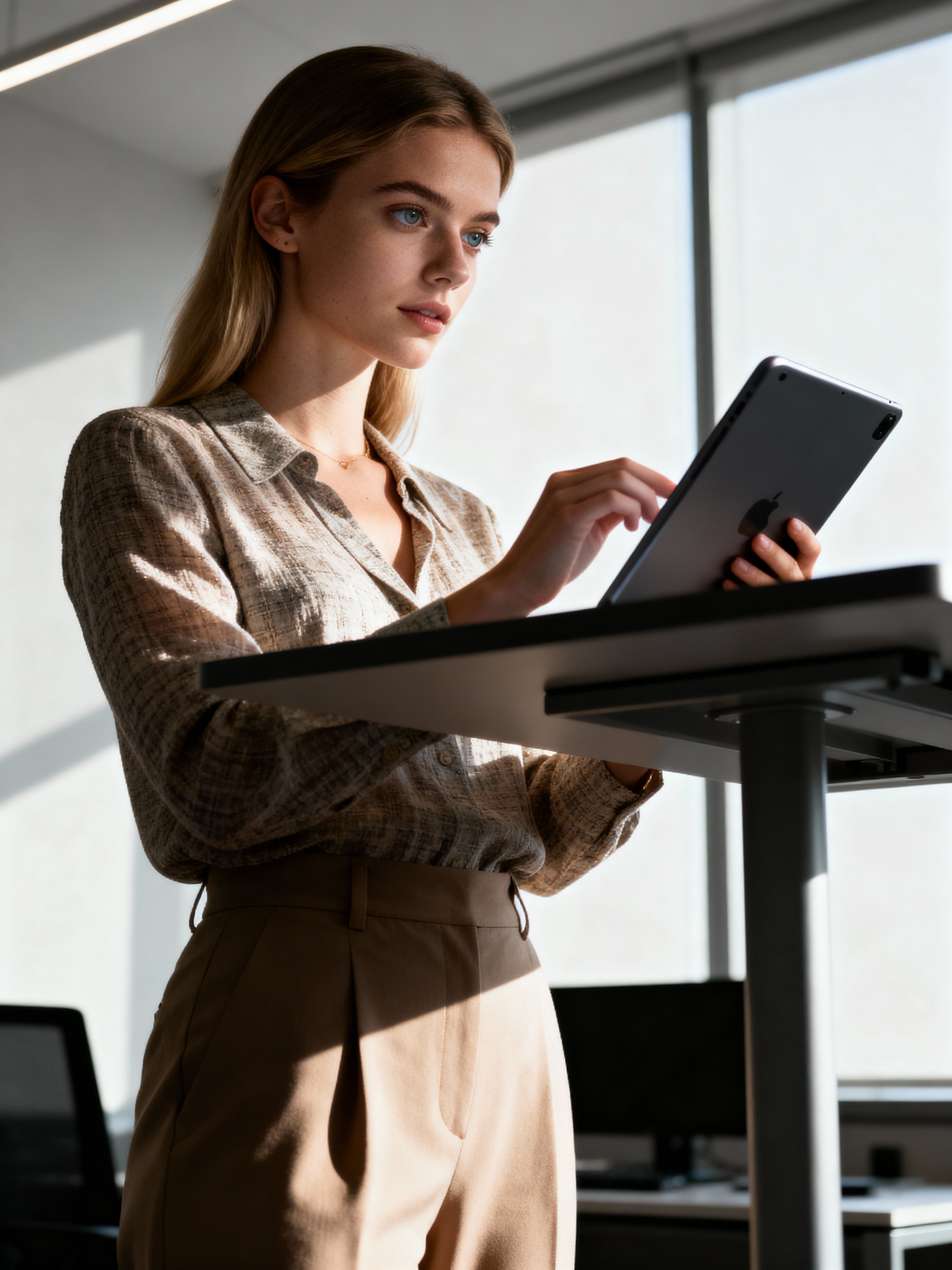 focused model in elegant yet comfortable business casual ensemble working with digital tablet, standing desk, minimalist office, soft natural light