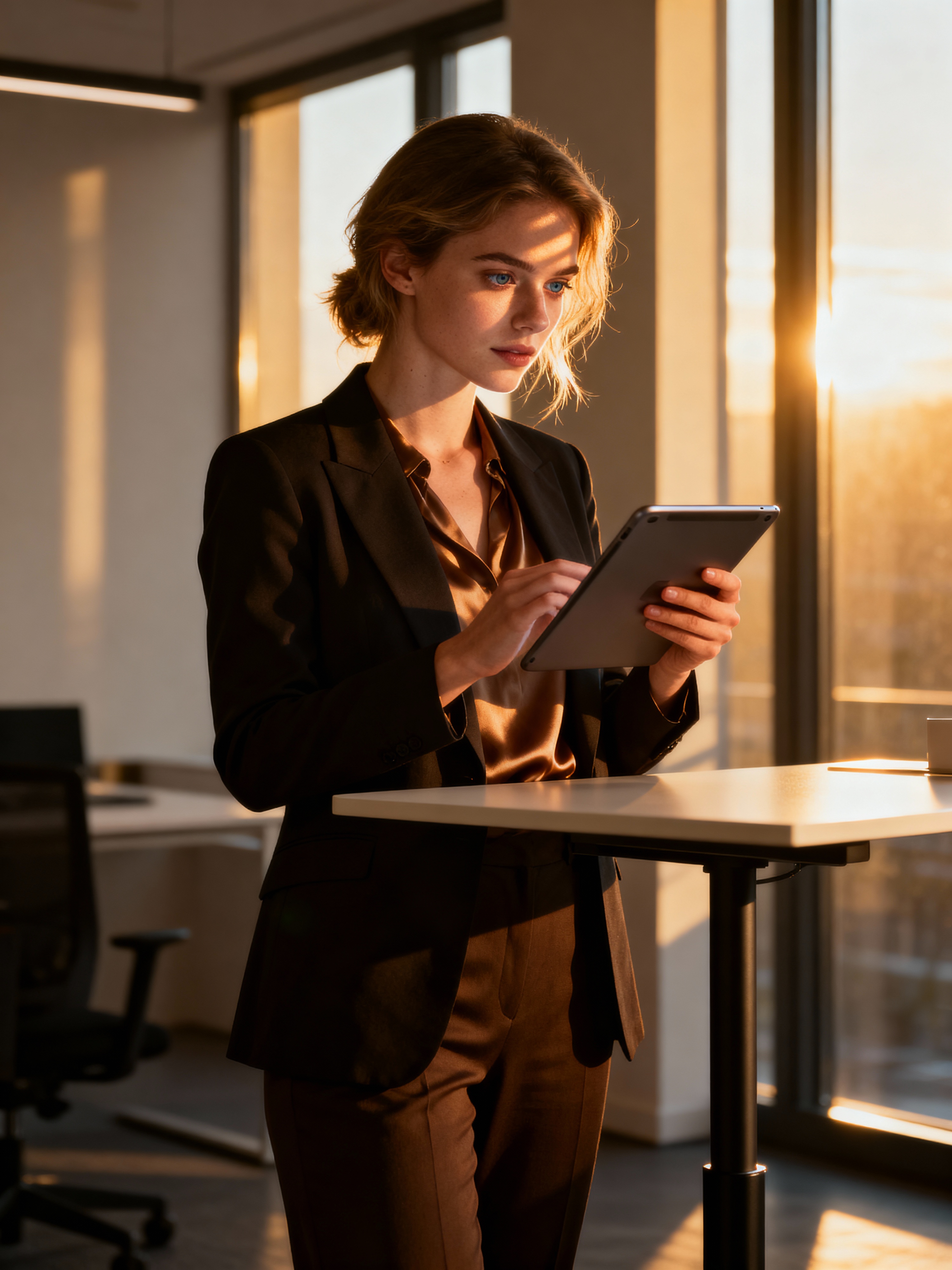 focused model in elegant yet comfortable business casual ensemble working with digital tablet, standing desk, minimalist office, soft natural light