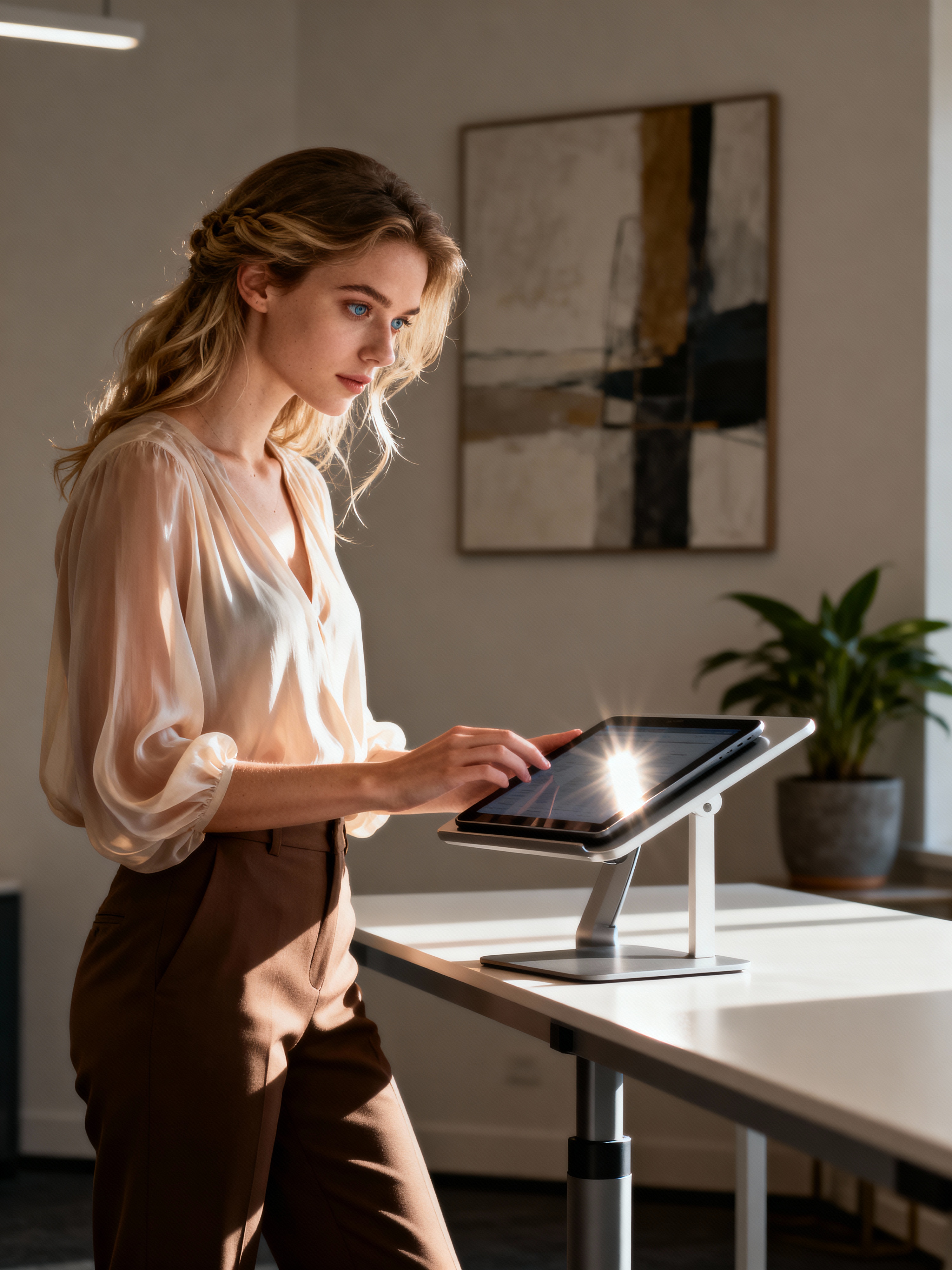 focused model in elegant yet comfortable business casual ensemble working with digital tablet, standing desk, minimalist office, soft natural light